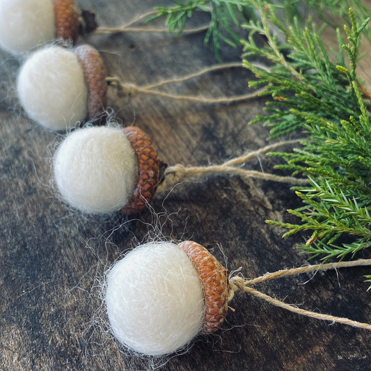 Felted Wool Acorn Ornaments with Red Oak Caps & Natural Hemp. Ivory or Tan
