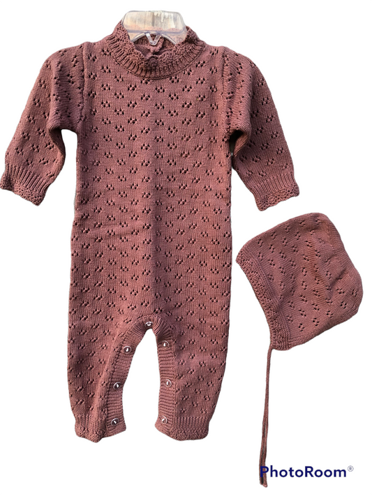 Plum Knitted Romper with Matching Bonnet