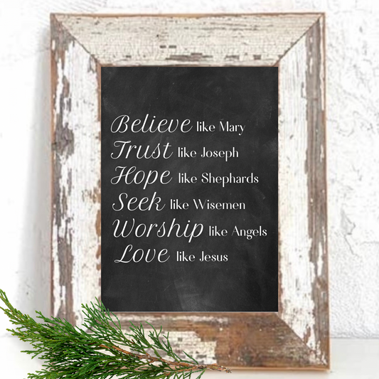 “Believe like Mary” Chalkboard Holiday Prints & Rustic Reclaimed Barn Wood 8 x 10 Frame