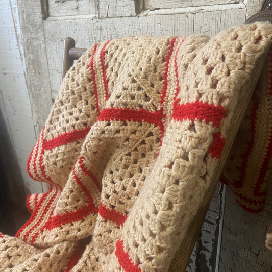 Vintage Crocheted Throw Blanket Red & Cream 45” x 45”