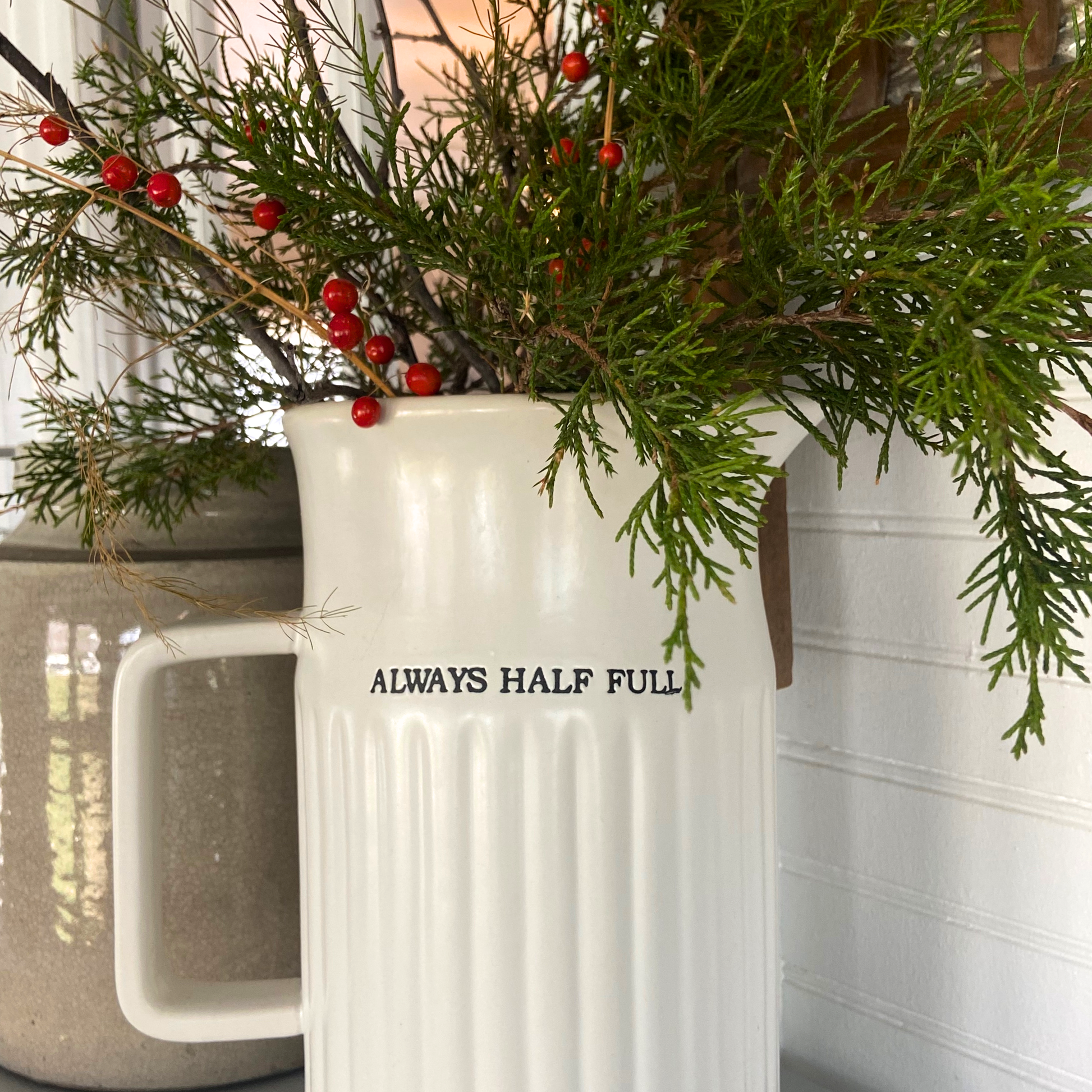 This white farmhouse-style serving pitcher adds a stylish, classic touch to your kitchen. With its simple message, "Always Half Full" a beautiful reminder to always stay positive!