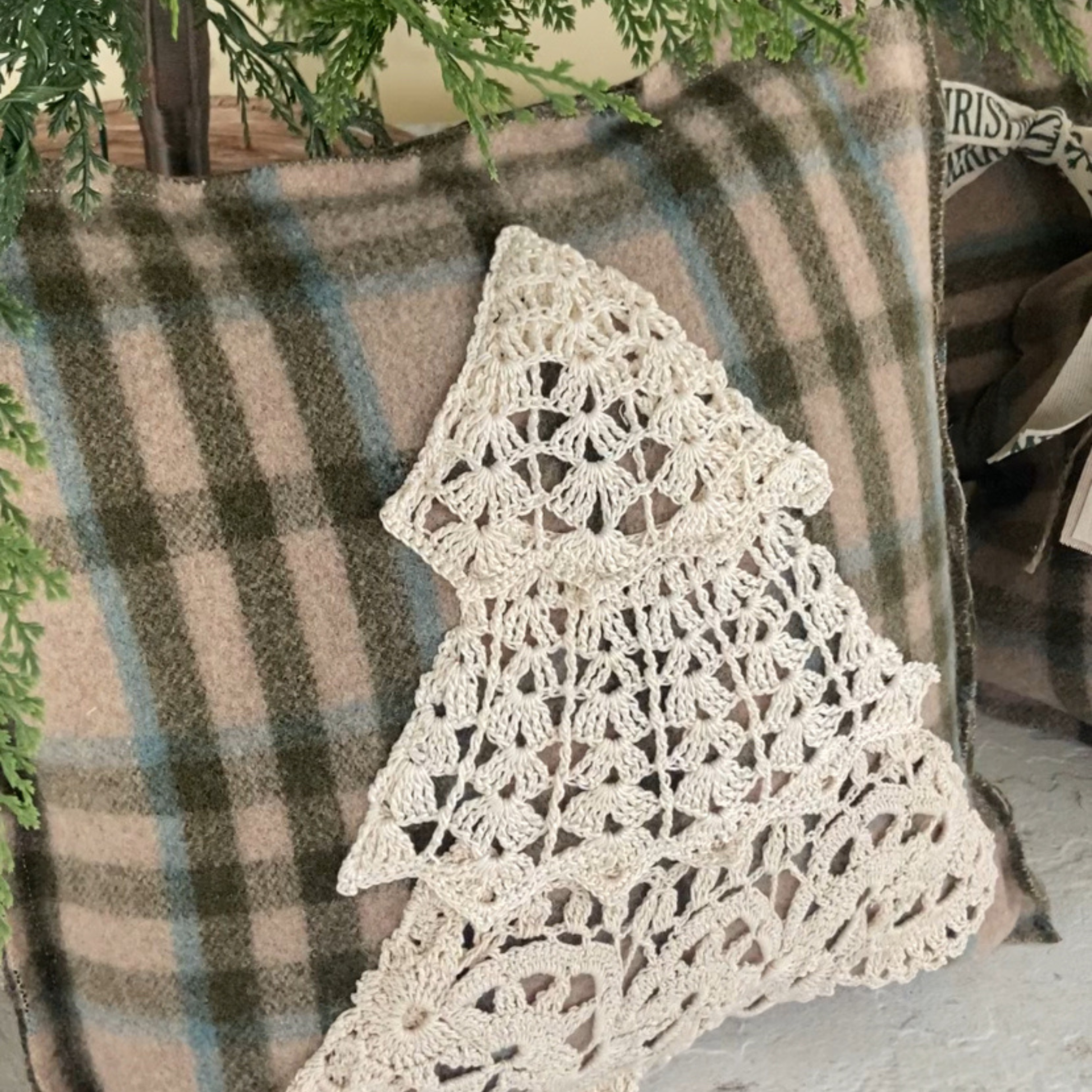 Bring home the charm of an old-fashioned Christmas with this nostalgic farmhouse accent pillow. Inspired by the simple beauty of a Christmas tree, this one-of-a-kind piece is crafted from a time-worn plaid wool blanket and adorned with hand-crocheted vintage collars—treasured keepsakes from holidays long ago. Each layer of the tree is unique, adding to its heirloom character and cozy, homespun appeal.