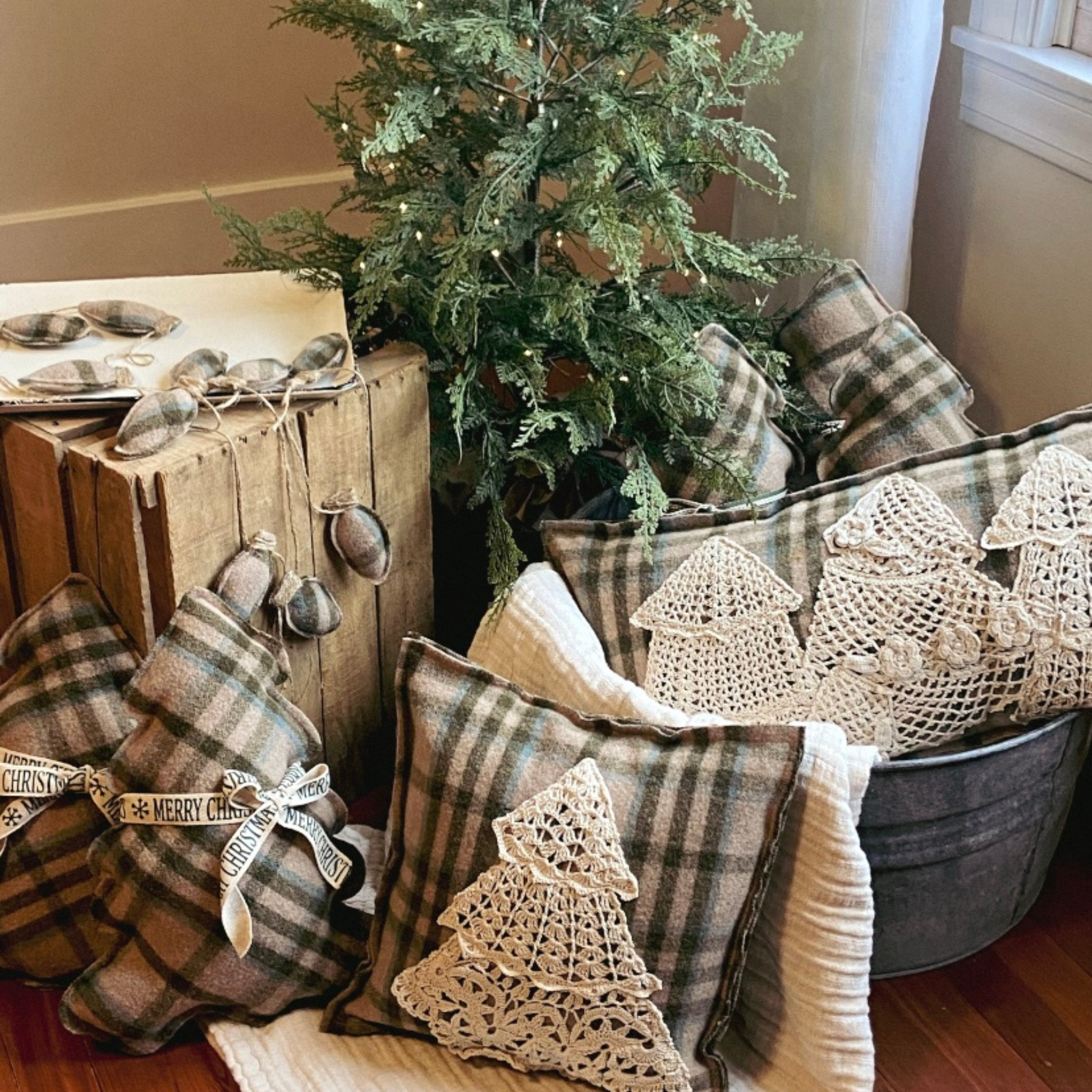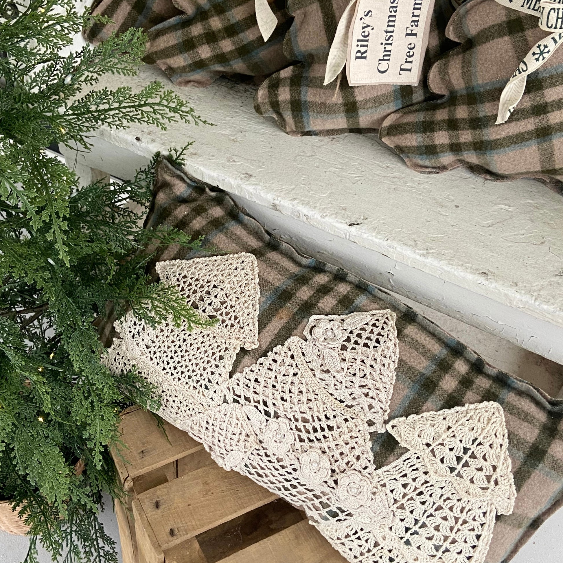 Bring home the charm of an old-fashioned Christmas with this nostalgic farmhouse accent pillow. Inspired by the simple beauty of a Christmas tree, this one-of-a-kind piece is crafted from a time-worn plaid wool blanket and adorned with hand-crocheted vintage collars—treasured keepsakes from holidays long ago. Each layer of the tree is unique, adding to its heirloom character and cozy, homespun appeal.