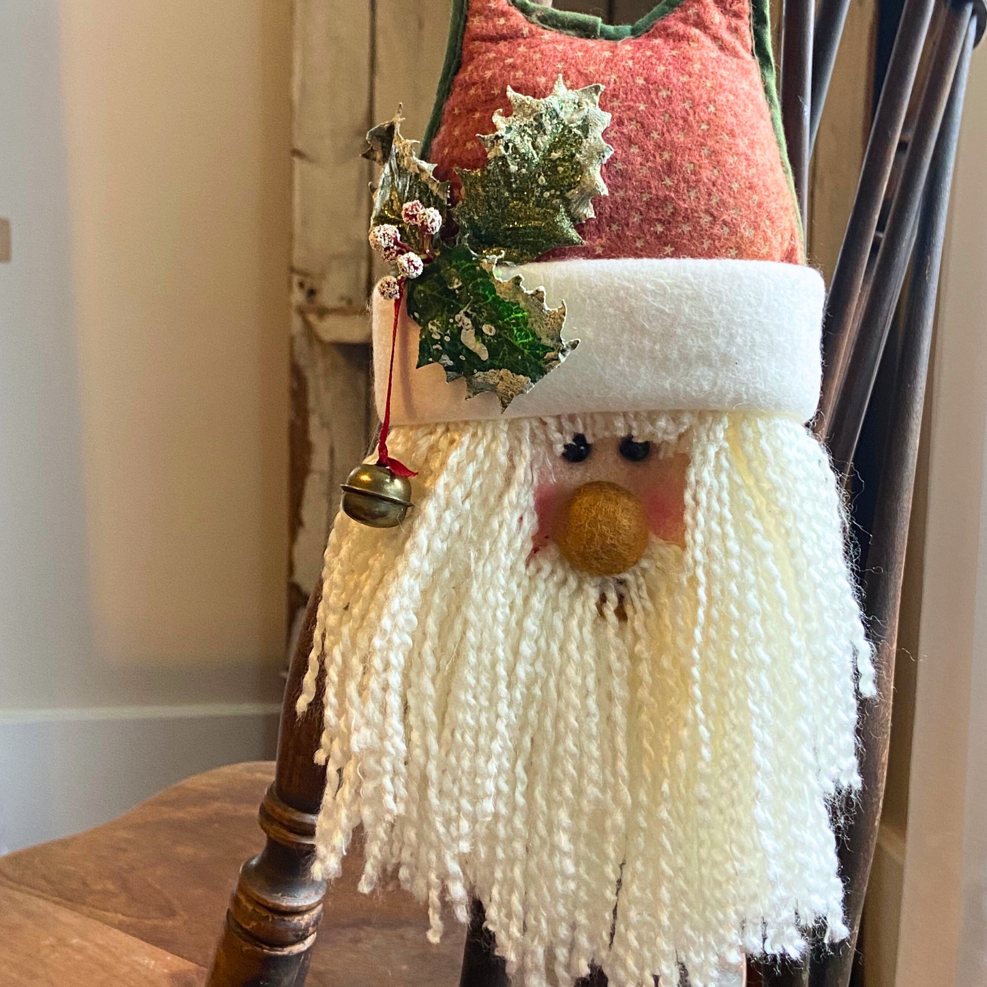 This vintage quilted door hanger is just the cutest. Quilted hat with Holly berries and leaves and a sod yarn beard.